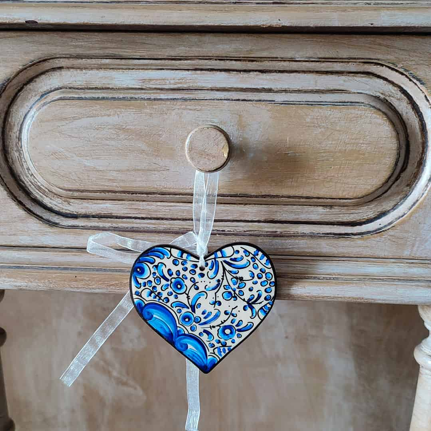 Peça em madeira pintada à mão com a pintura tradicional de Coimbra. Para pendurar num puxador de porta, numa gaveta ou na árvore de Natal.